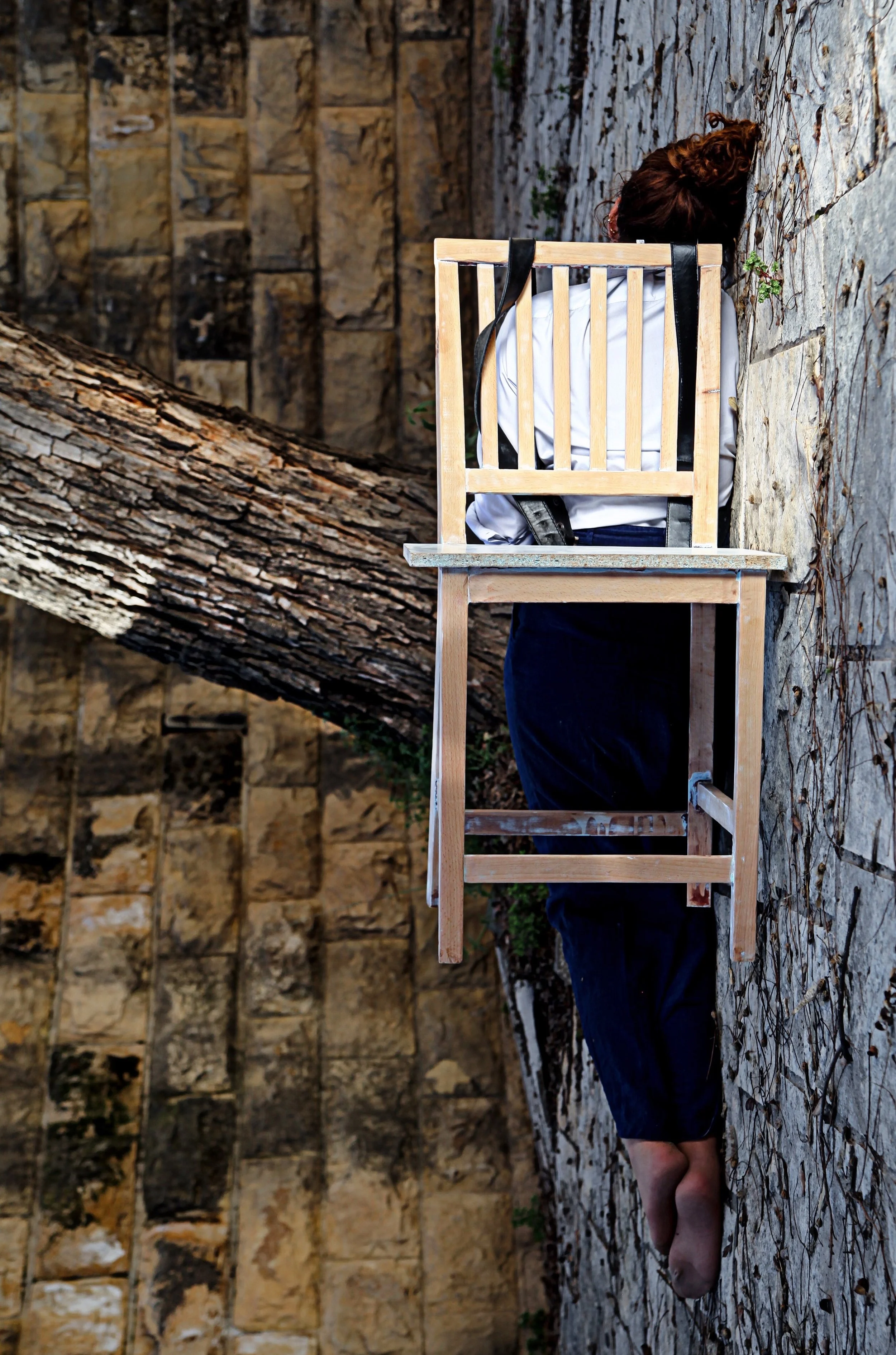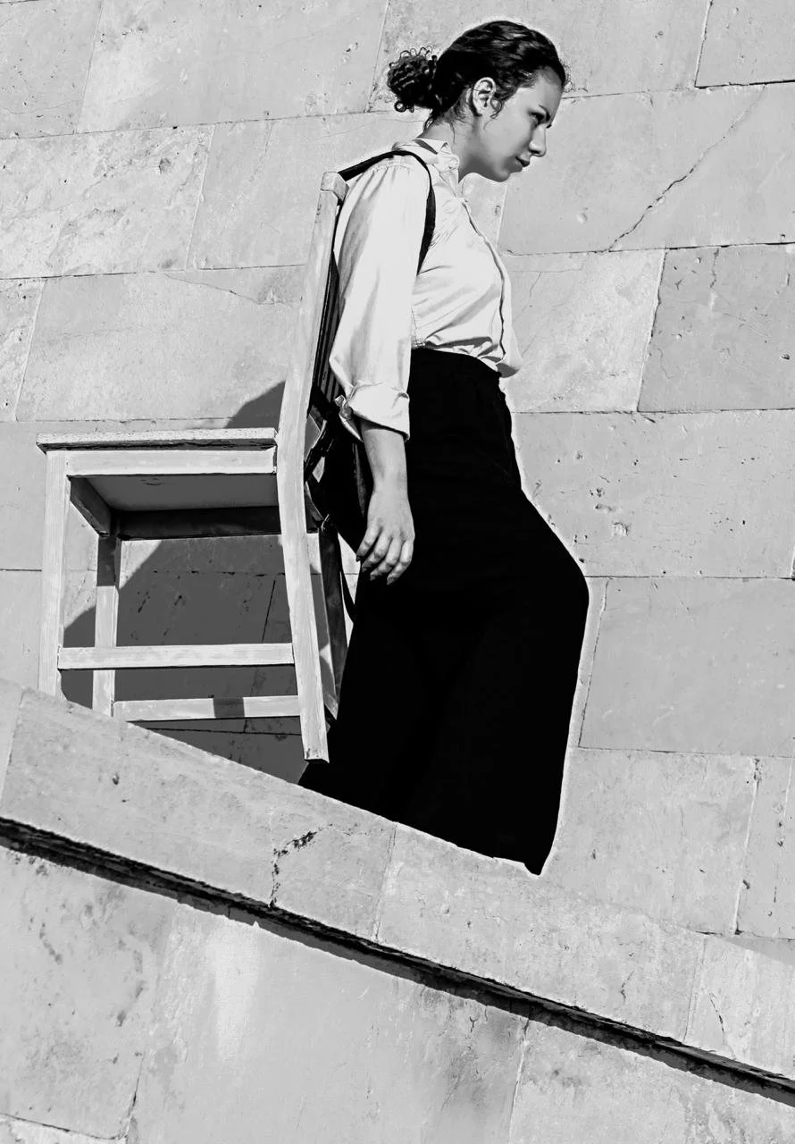 Younes tied a chair to her back and walked with it in the streets of Jerusalem, took a bus, took a shower and hiked on the side of a highway. This is an act of searching for a place to rest without the ability to do so. The object that you can rest on is attached to your body and simultaneously prevents you from doing so. Furthermore, it functions as violent disciplinary tool.